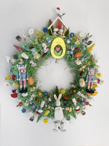 Here is something to brighten your door for Easter and Springtime cheer - a Handcrafted Vintage Wooden Easter Ornament Kitsch Wreath! Hand-crafted with lots of vintage and retro-style hand-painted wooden Christmas ornaments including a rabbit string puppet, rabbit nutcrackers, bells, birds, tulips, bees, ladybugs, daisies, chickens, Easter eggs and more all on a Styrofoam wreath wrapped in green Easter grass tinsel, with a loop on the back for hanging. Diameter is between 14-16 inches. I … [Read more...]
