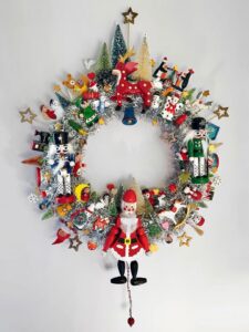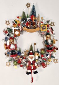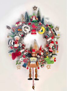 SOLD Here is something to brighten your door for Christmas and the Winter Holidays - a Handcrafted Vintage Wooden Ornament Kitsch Wreath! Hand-crafted with lots of vintage and retro-style hand-painted wooden Christmas ornaments including a Santa string puppet, nutcrackers, bells, angels, stars, a reindeer, penguins, snowshoe hares, a monkey, snowmen, an owl, bears, and more all on a Styrofoam wreath wrapped in silver tinsel, with a loop on the back for hanging. Diameter is between 14-16 … [Read more...]