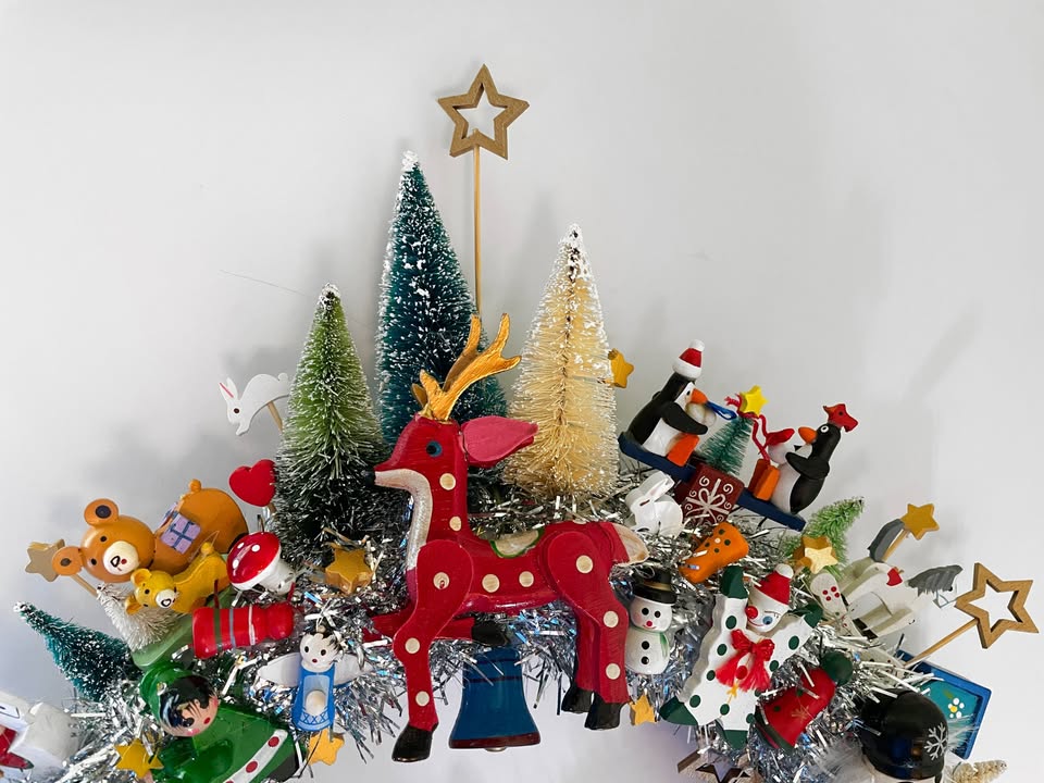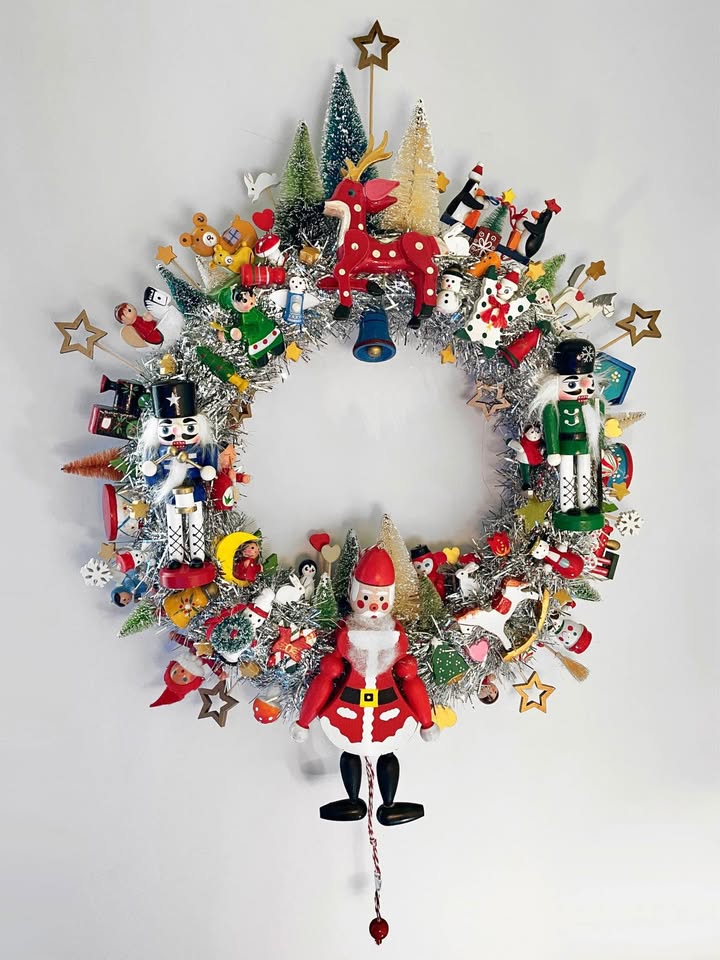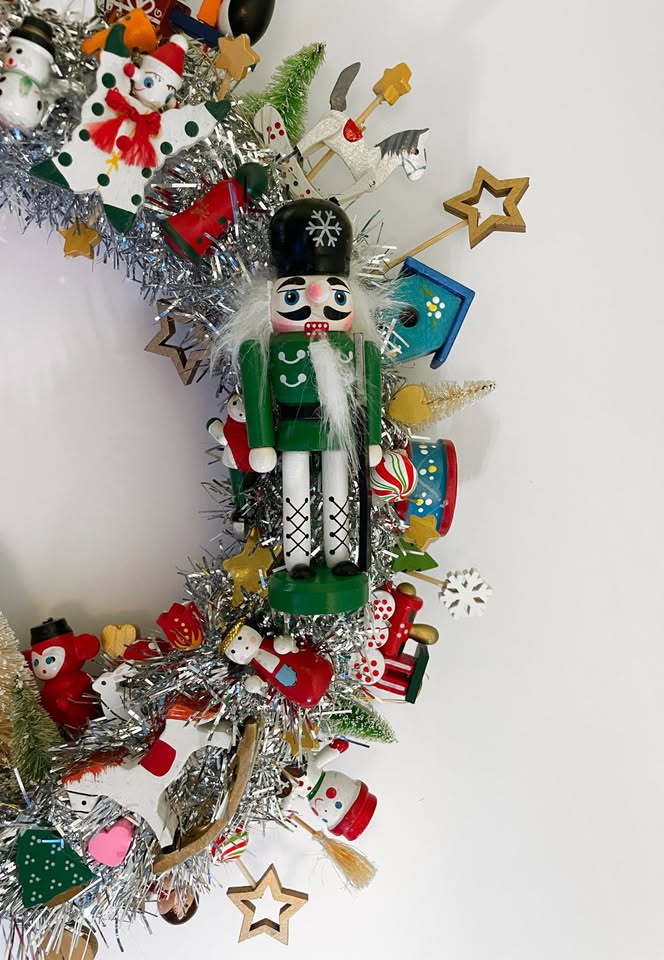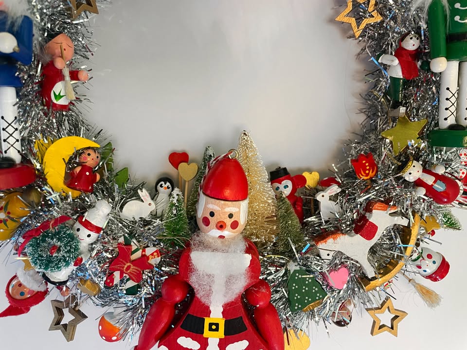 Here is something to brighten your door for Christmas and the Winter Holidays — a Handcrafted Vintage Wooden Ornament Kitsch Wreath!