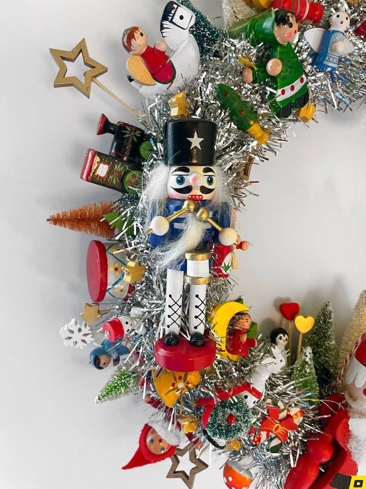 Hand-crafted with lots of vintage and retro-style hand-painted wooden Christmas ornaments including a Santa string puppet, nutcrackers, bells, angels, stars, a reindeer, penguins, snowshoe hares, a monkey, snowmen, an owl, bears, and more all on a Styrofoam wreath wrapped in silver tinsel, with a loop on the back for hanging. Diameter is between 14–16 inches.