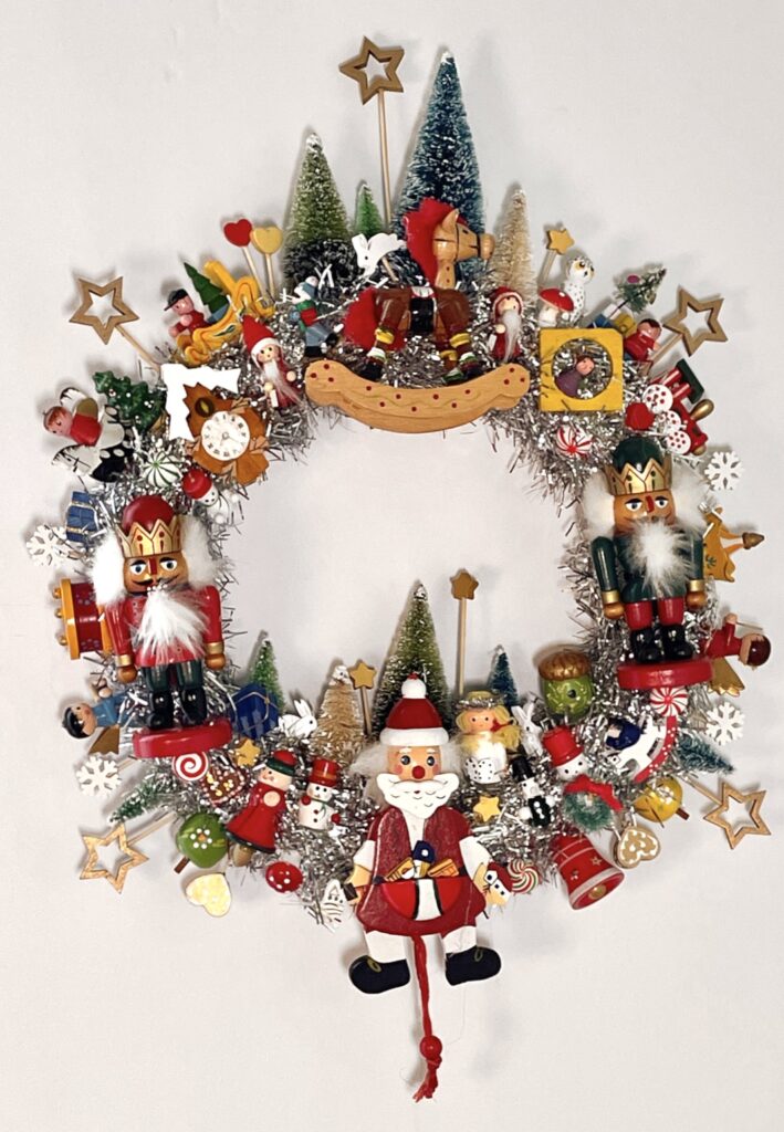 Hand-crafted with lots of vintage and retro-style hand-painted wooden Christmas ornaments including a Santa string puppet, nutcrackers, bells, angels, stars, snowshoe hares, cuckoo clock, elves, snowmen, an owl, bears, and more all on a Styrofoam wreath wrapped in silver tinsel, with a loop on the back for hanging. Diameter is between 14–16 inches.