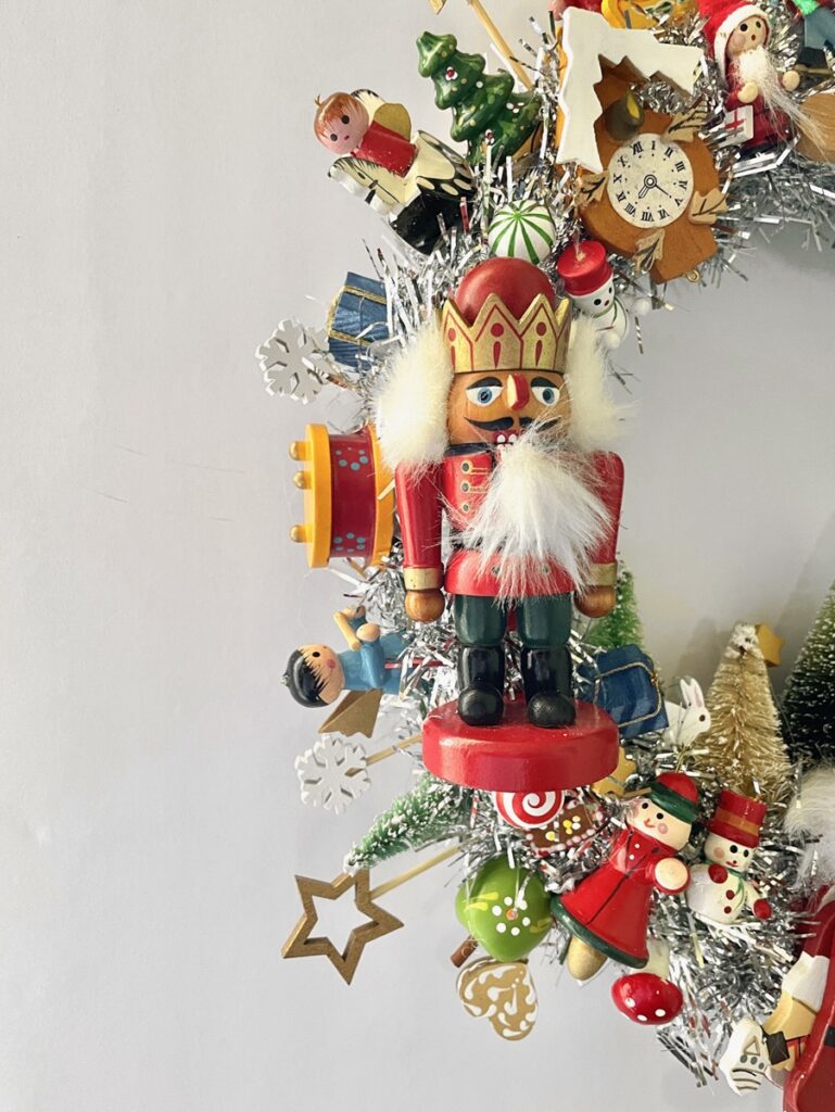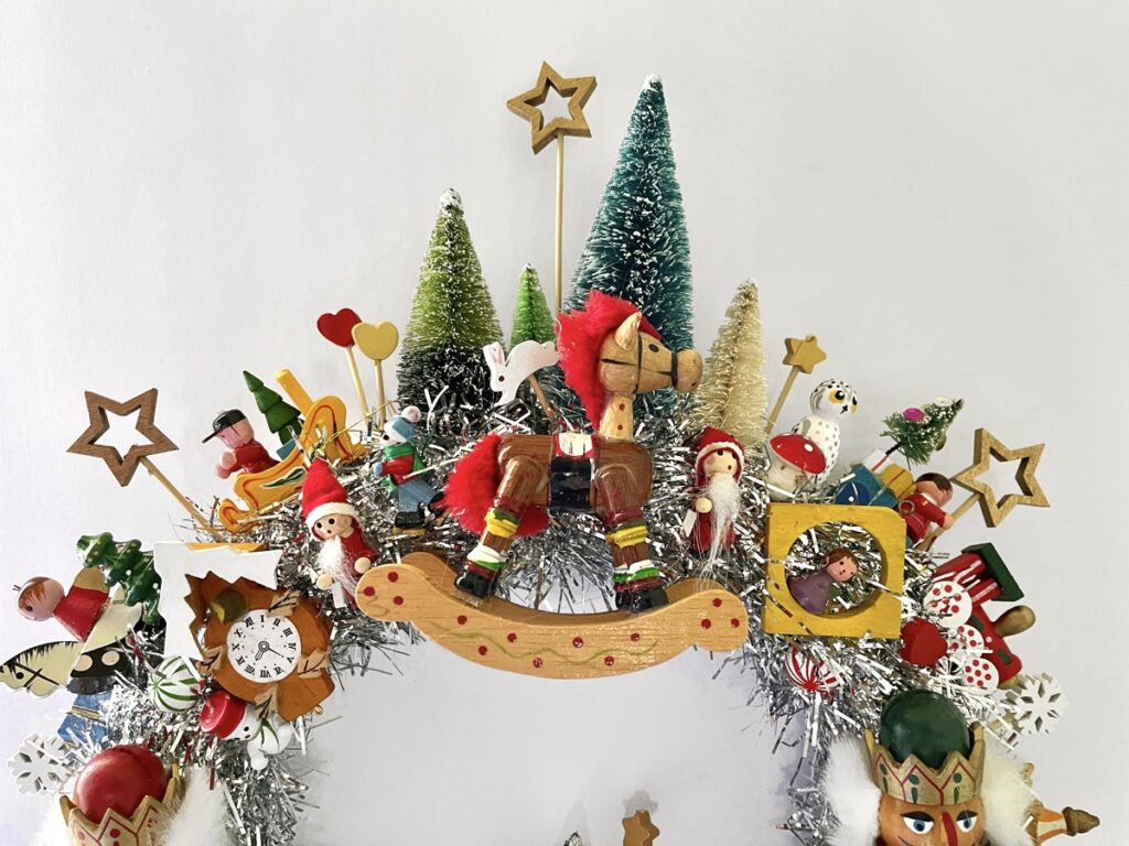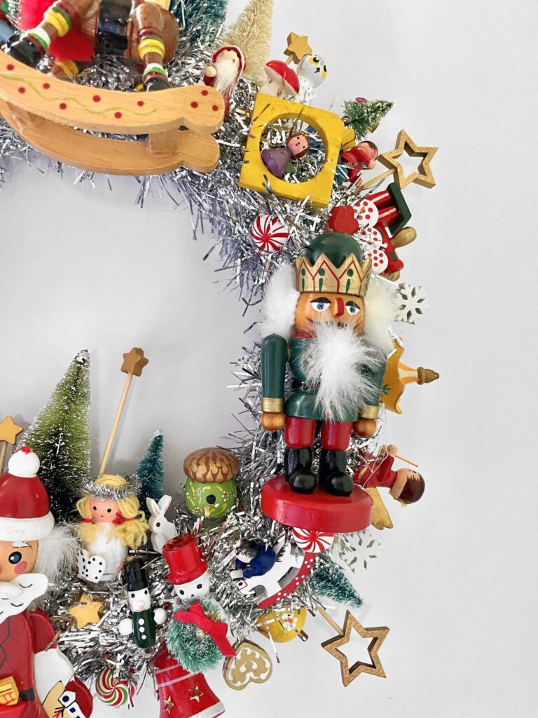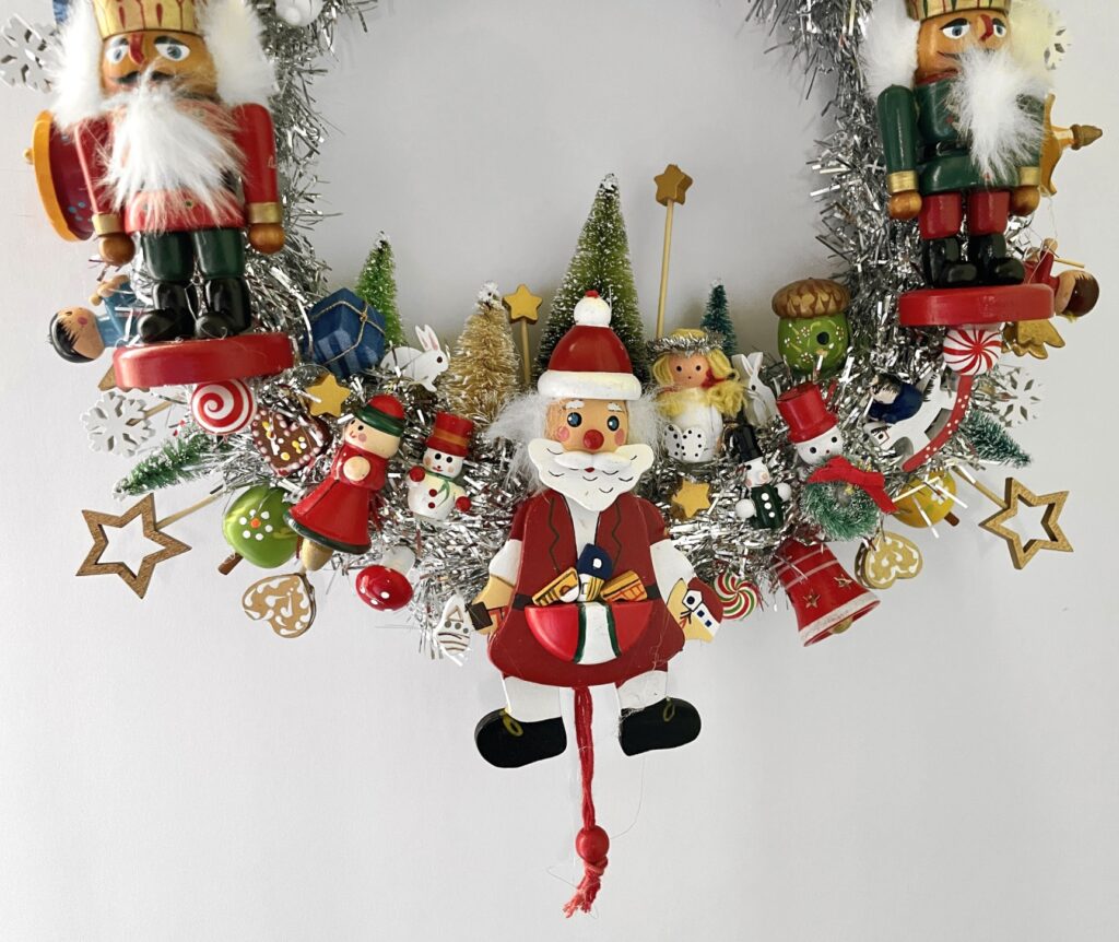 Here is something to brighten your door for Christmas and the Winter Holidays — a Handcrafted Vintage Wooden Ornament Kitsch Wreath!
