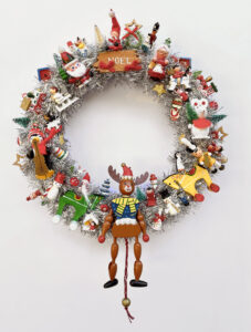 SOLD Here is something to brighten your door for Christmas and the Winter Holidays - a Handcrafted Vintage Wooden Ornament Kitsch Wreath! Hand-crafted with lots of vintage and retro-style hand-painted wooden Christmas ornaments including a Santa string puppet, nutcrackers, bells, angels, stars, a reindeer, penguins, snowshoe hares, a monkey, snowmen, an owl, bears, and more all on a Styrofoam wreath wrapped in silver tinsel, with a loop on the back for hanging. Diameter is between 14-16 … [Read more...]